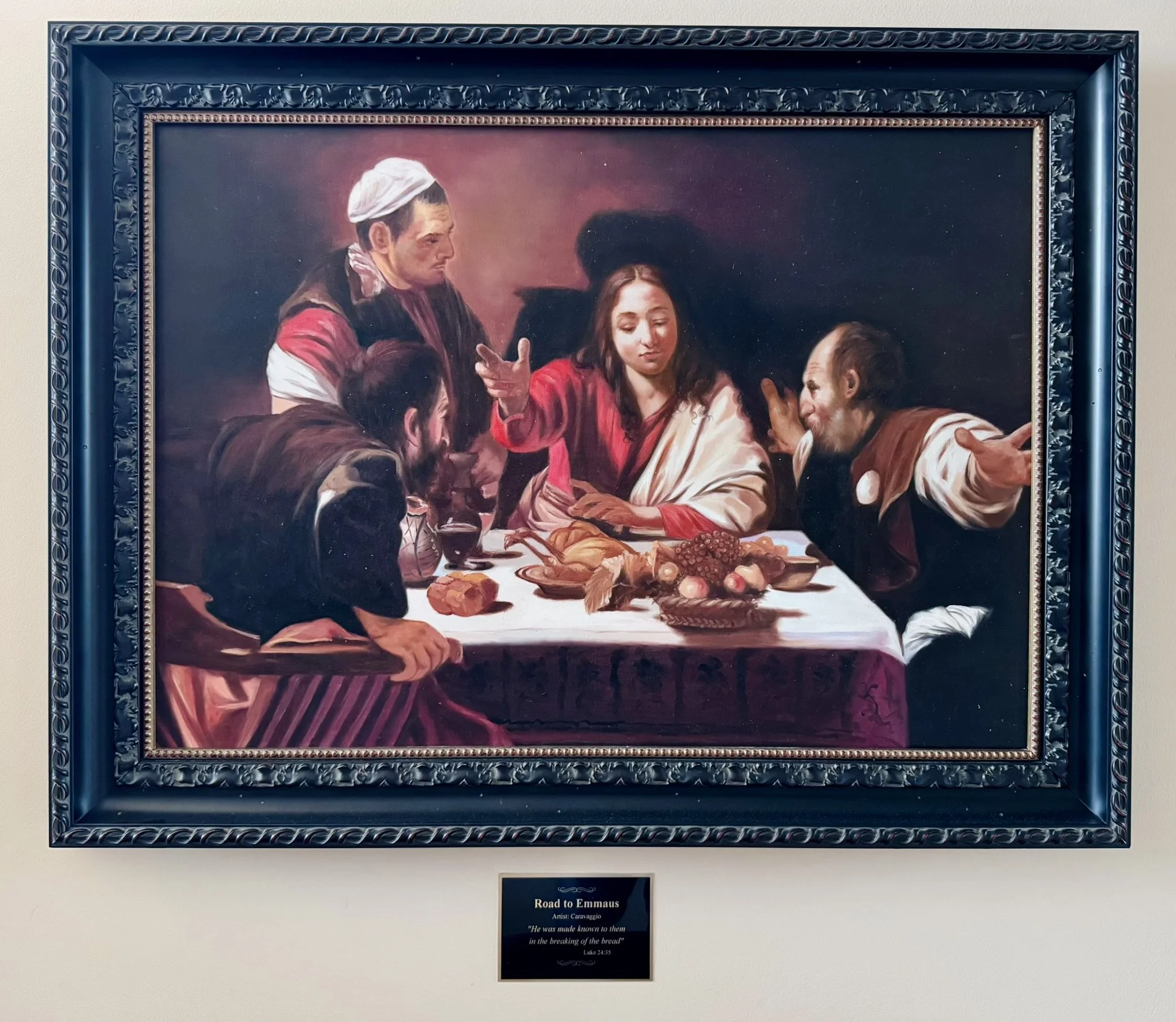 In the vesting room there is a replica of the beautiful painting of Caravaggio titled the "Supper at Emmaus,” based on Luke 24. It tells the familiar story of the two disciples walking to Emmaus. On the day of the resurrection, with their hearts heavy with grief from witnessing the death of Jesus, they leave Jerusalem and start walking towards the town of Emmaus. On the road as they discussed their disappointment about Jesus and his promises, the risen Christ joined them on the way and started conversing with them, but they didn't recognize him. As they reached Emmaus they told him: “Stay with us and spend the night as it is getting dark.” At the dinner table at the point of the breaking of the bread, the two disciples jumped off their seats and finally recognized that Jesus was in front of them! The breaking of the bread made Jesus present to them. Their hearts were transformed with more Faith, Hope and Love - and they quickly turned around and went back to Jerusalem and testified to the apostles what they had seen.